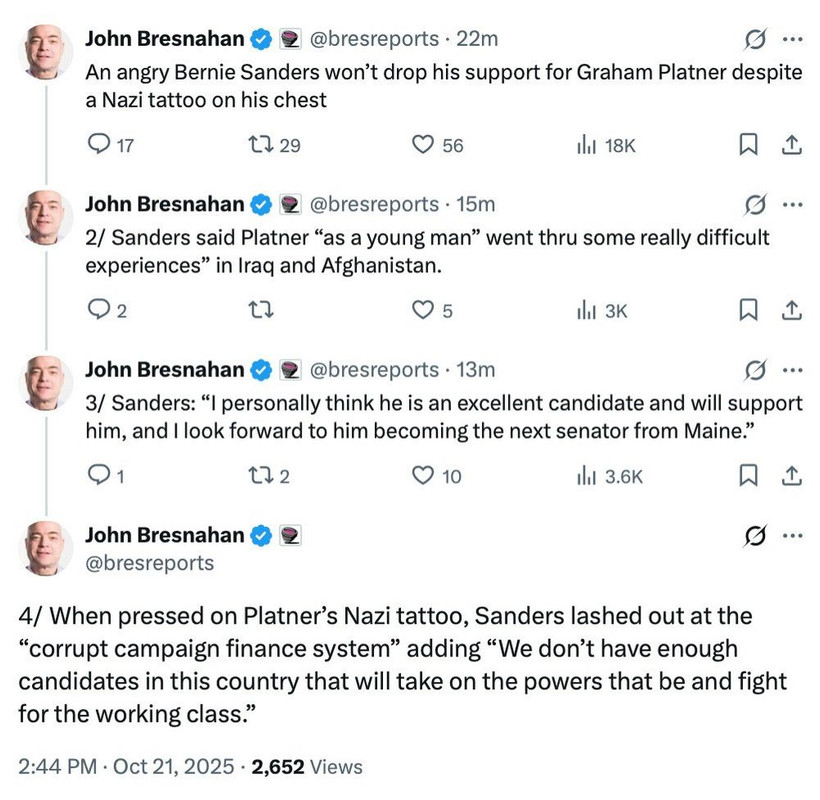 I'm so glad Gov Mills got in the race. Platner raises all kinds of red flags when he is actually vetted (nazi tattoo, comments about Black folks tipping and sexual assault victims, ex mercenary for Constellis (formerly Blackwater), etc.). We certainly don't need Fetterman 2.0 in the senate.