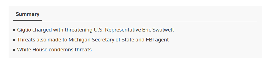 The White House condemned the threats against Swalwell. "As a survivor of multiple assassination attempts, the president takes these matters extremely seriously, said White House spokesperson Harrison Fields. Anyone engaging in such behavior will be held accountable to the fullest extent of the law." The complaint cites a 2024 Reuters investigation that identified Giglio as a persistent source of threats against public officials, including judges, lawmakers and state election officials. Despite multiple investigations by federal agencies, including the FBI and the Secret Service, Giglio had not previously been charged, as his messages often stopped short of the legal threshold for prosecution under the First Amendment, according to the Reuters report.
