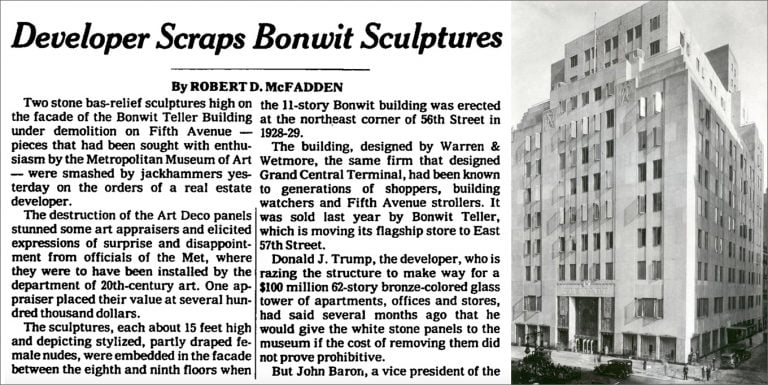 The venerable Bonwit Teller department store closed its store at Fifth and 56th in 1979. The building was bought by Trump to be demolished so he could build his hideous "Trump Tower." The Bonwit Teller building had an artistic elegant facade that featured a spectacular 15-foot-high Art Deco sculptural ensemble. It was a treasured landmark in New York! (Google and find the image.)