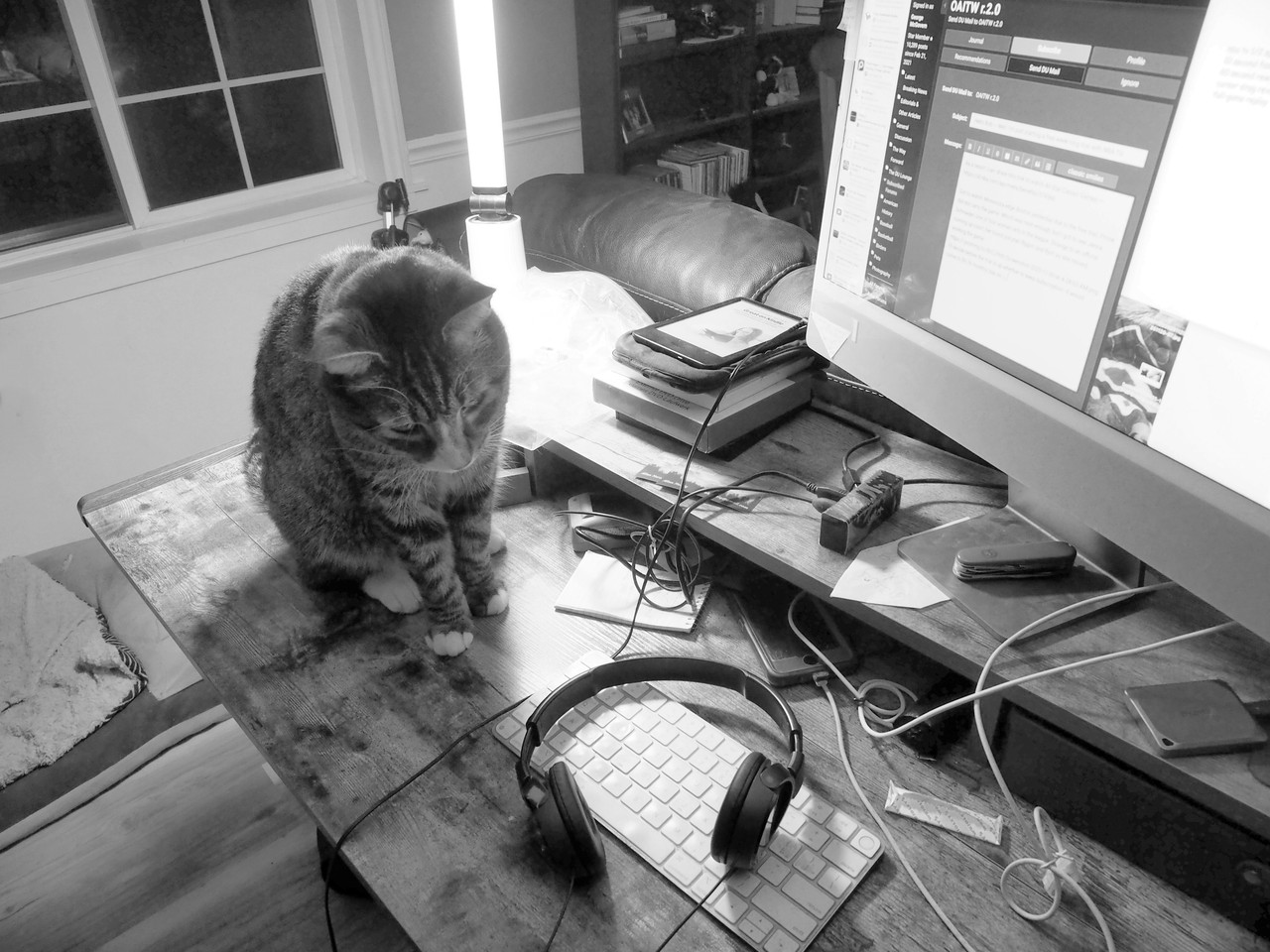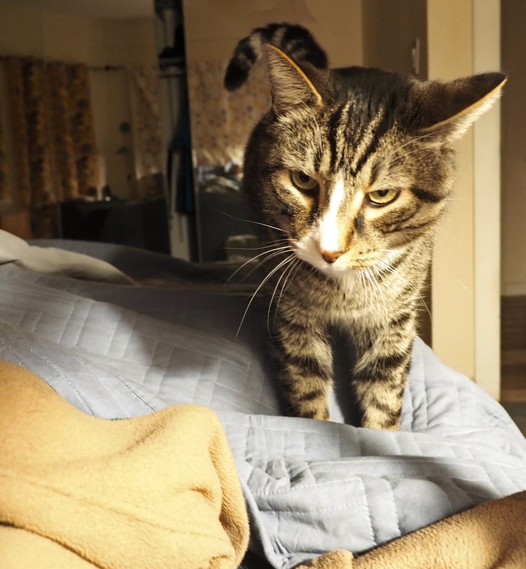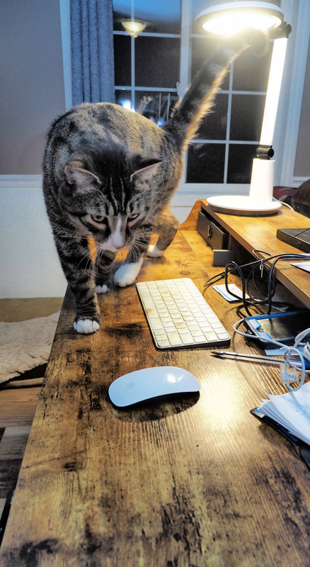 Got restless. Hopped up on the computer desk. "Hi Dad. Oh you don't have to get up."